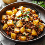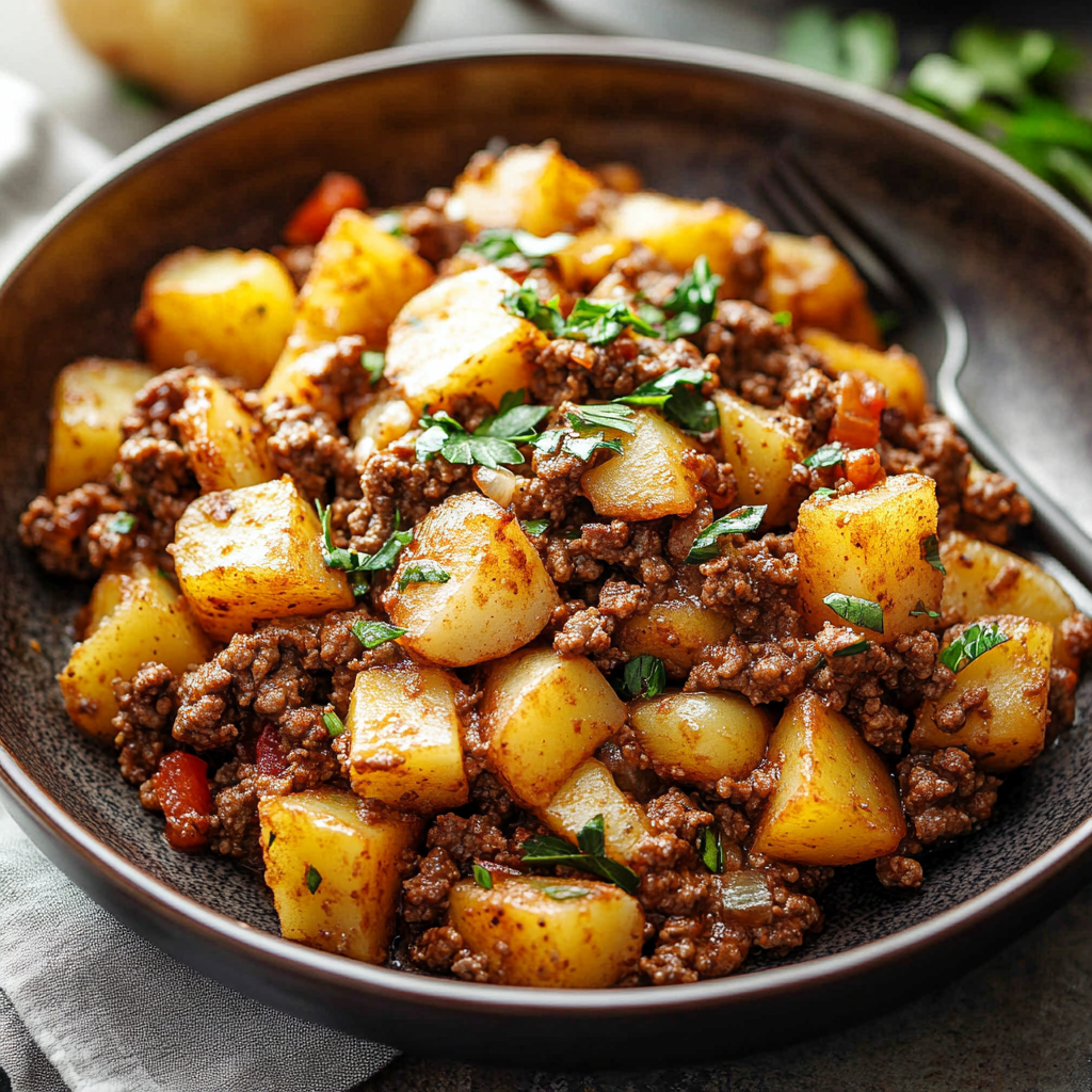 Serve Up Your Creation!: Spoon out your ground beef and potato mixture onto plates or into bowls. Garnish with fresh herbs if desired! Enjoy every savory bite while recalling fond memories around your own dinner table.