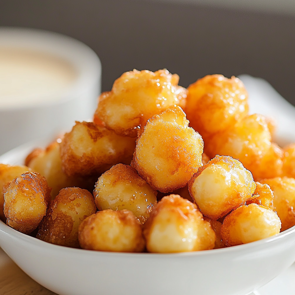 Start by heating your oil in a deep pot while preparing the cheese. Once the oil reaches 350°F, gently drop the curds in batches for even frying.