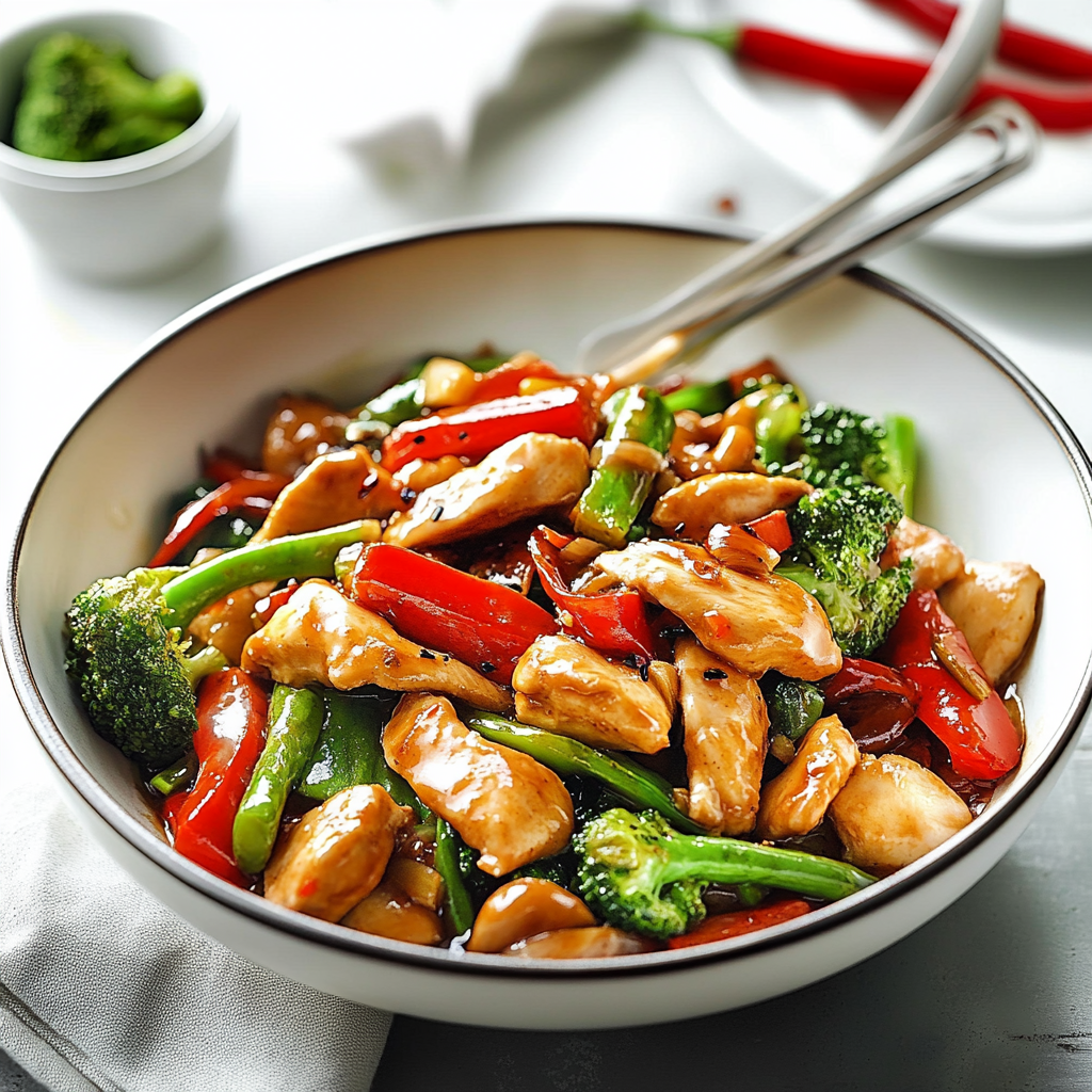 This vibrant chicken stir fry with vegetables is the perfect weeknight meal, bursting with flavor and color. Tender, juicy chicken meets a medley of crisp vegetables, all coated in a savory sauce that will make your taste buds sing. Quick to prepare and easy to customize with whatever veggies you have on hand, this dish is not only satisfying but also a delightful way to sneak more greens into your diet. Serve it over rice or noodles for a complete meal that everyone will love.