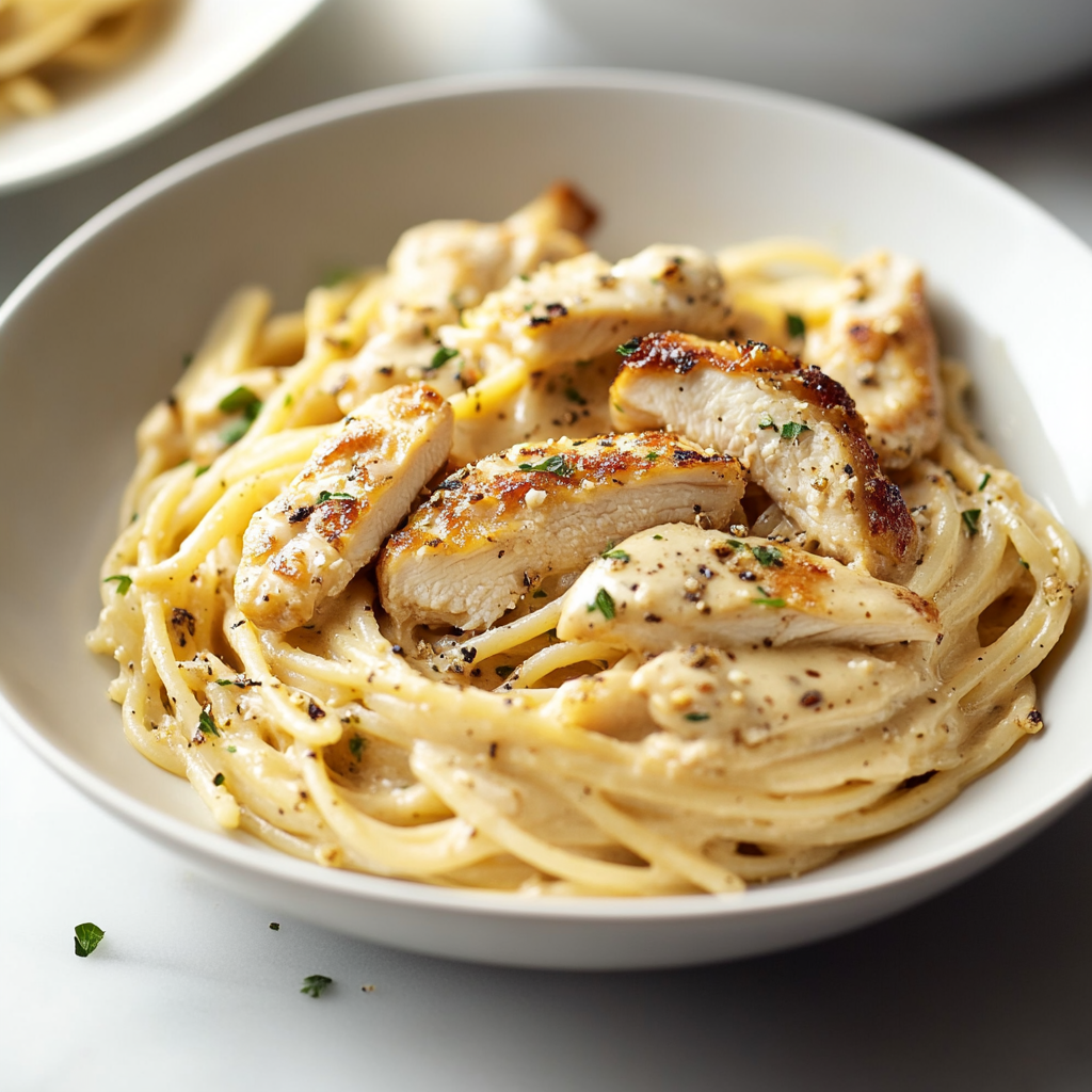 Cook your choice of pasta according to package instructions until al dente. Drain it well before adding it directly into your creamy garlic sauce along with sliced chicken pieces. Toss everything together gently so each piece is coated beautifully.