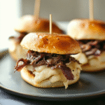 Serve with Dipping Sauce: Serve each slider alongside small bowls of warm beef broth for dipping. Feel free to garnish with extra sautéed onions or any toppings you love!