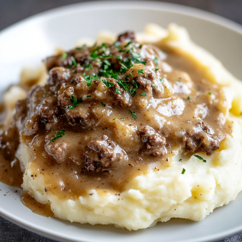 Plate It Up!: Serve generous amounts of hamburger gravy over heaping servings of mashed potatoes on each plate. Garnish with freshly chopped parsley if desired—this adds color and flair!
