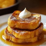 Indulge in the cozy flavors of fall with this Pumpkin French Toast. Thick slices of bread soaked in a creamy pumpkin mixture are pan-fried to golden perfection and drizzled with rich maple syrup. This easy-to-make dish is perfect for lazy mornings or festive brunches, bringing warmth and joy to your breakfast table.