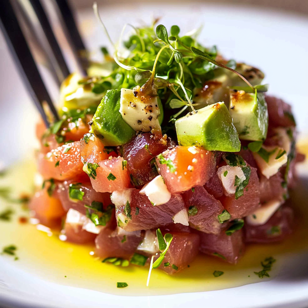 Tuna Tartare is a stunning and refreshing dish that brings the vibrant flavors of fresh sushi-grade tuna to your table. Bursting with zesty lime, creamy avocado, and a hint of sesame oil, this elegant appetizer is perfect for impressing guests or enjoying a cozy night in. With its beautiful presentation and easy preparation, Tuna Tartare is not just a meal; it’s an experience. Dive into this culinary delight that promises to tantalize your taste buds!